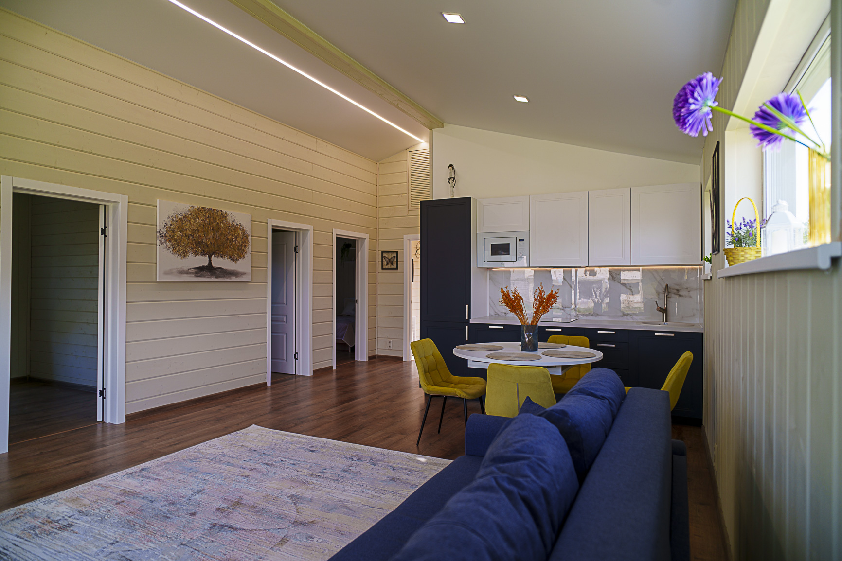 Охраняемый коттеджный поселок Поляны на берегу пруда в окружении леса. Отличный дом с полной отделкой с 3 спальнями и большой гостиной на Новорижском шоссе на участке 7,5 соток.